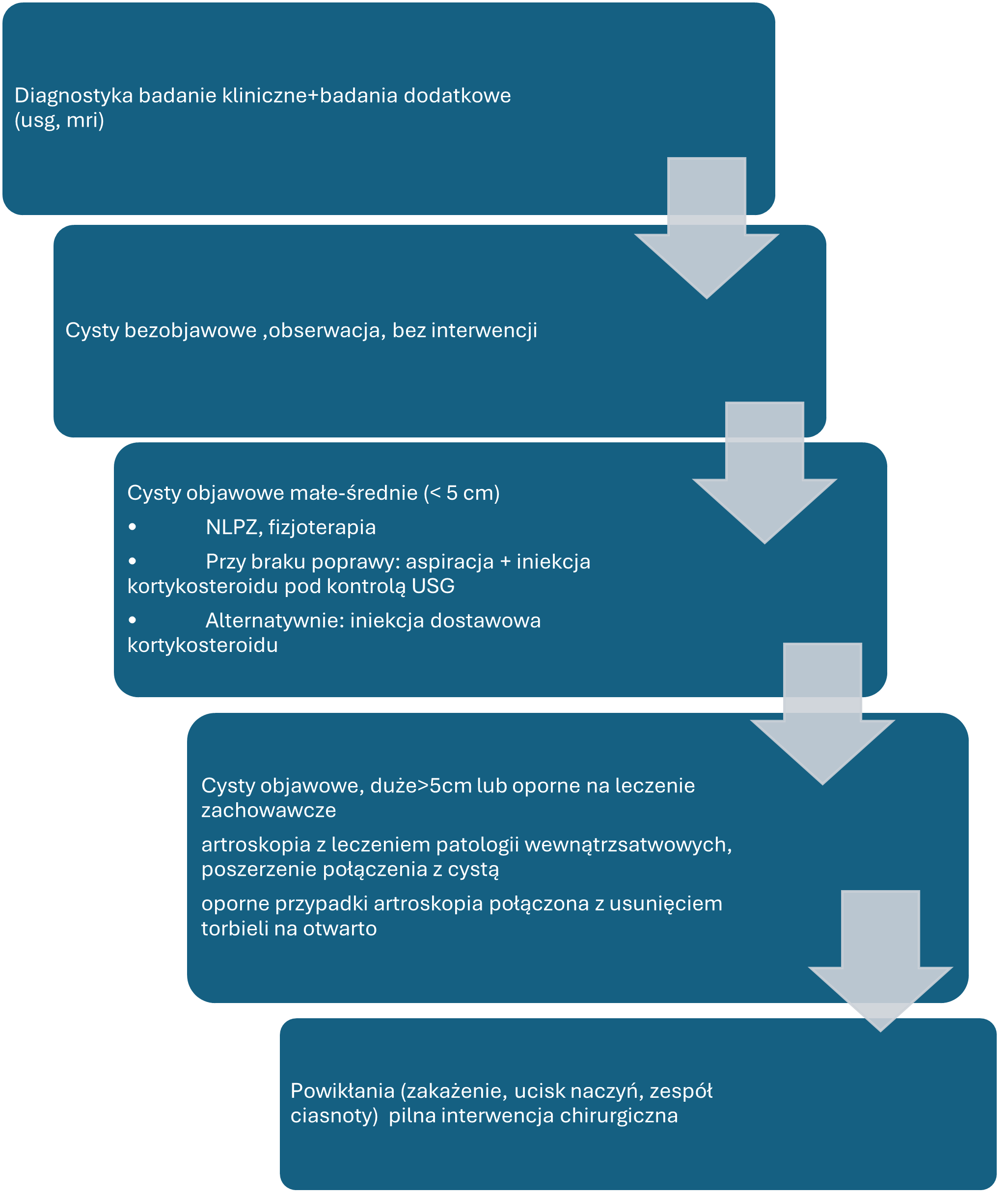 Kluczowym elementem skutecznego leczenia chirurgicznego jest rozwiązanie pierwotnej patologii wewnątrzstawowej, która doprowadza do powstania cysty16. Izolowana resekcja cysty bez leczenia schorzenia wewnątrzstawowego wiąże się z wysokim odsetkiem nawrotów sięgającym nawet 63%.